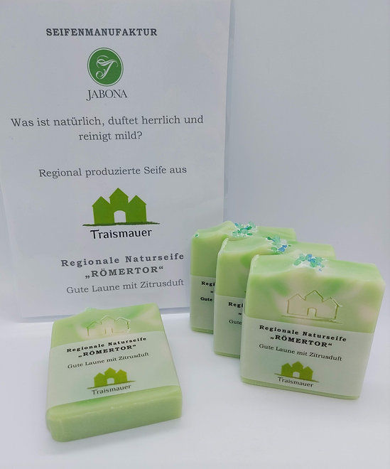 Die Traismaurer Naturseife »Römertor« soll das Wahrzeichen und Logo der Stadtgemeinde Traismauer präsentierten. Die Seife mit dem beliebten Citrusduft der Guten Laune ist die erste regional produzierte Naturseife, die eine Verbindung schaffen soll zur der Stadt in der sie hergestellt wird.